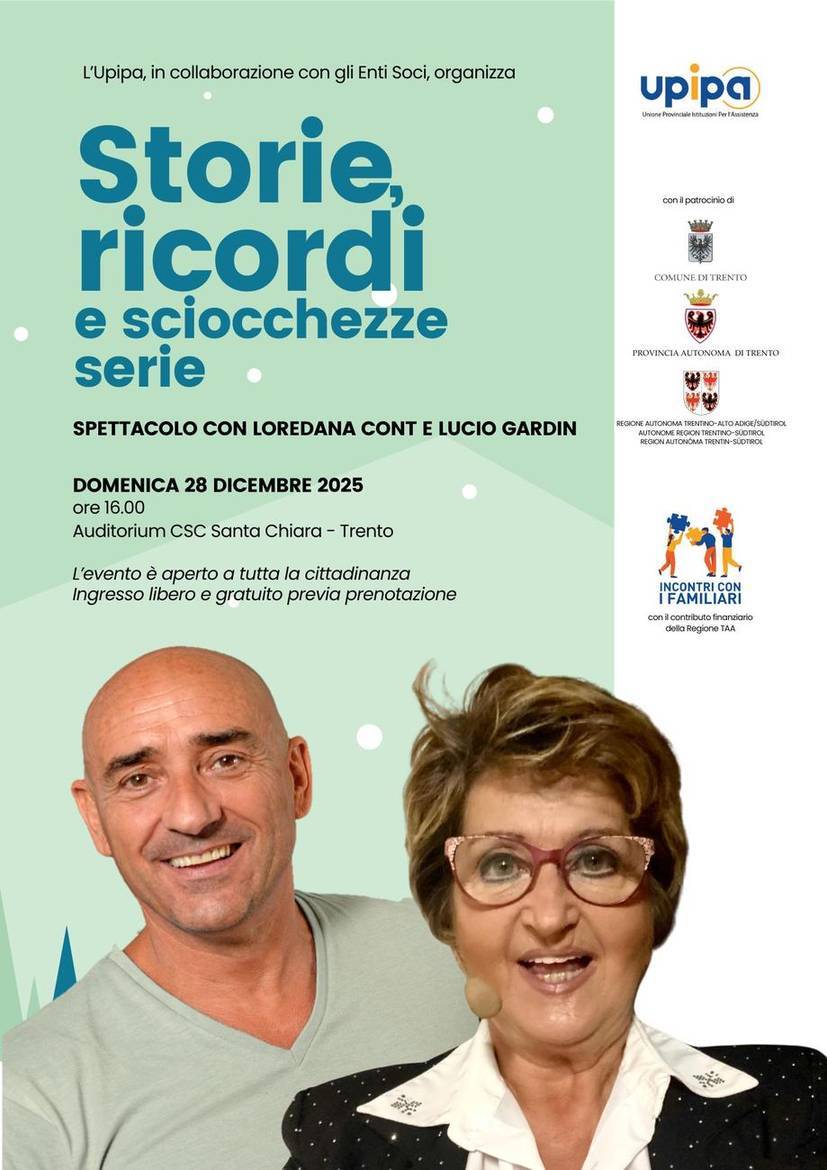 Domenica 28 dicembre 2025 all’ Auditorium Santa Chiara di Trento si è svolto lo spettacolo “Storie, ricordi e sciocchezze serie”. Protagonisti dell'evento i comici Loredana Cont, Lucio Gardin e i docenti della rete UPIPA coinvolti in corso d’anno, che hanno offerto alcuni spunti di riflessione agli oltre 800 familiari, volontari, operatori e residenti presenti e giunti per l’occasione da ogni angolo del Trentino.