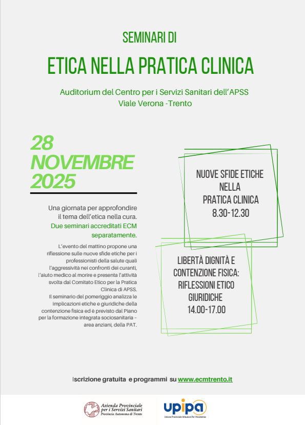 L’evento del mattino propone una riflessione sulle nuove sfide etiche per i professionisti della salute quali l’aggressività nei confronti dei curanti, l’aiuto medico al morire e presenta l’attività svolta dal Comitato Etico per la Pratica Clinica di APSS.